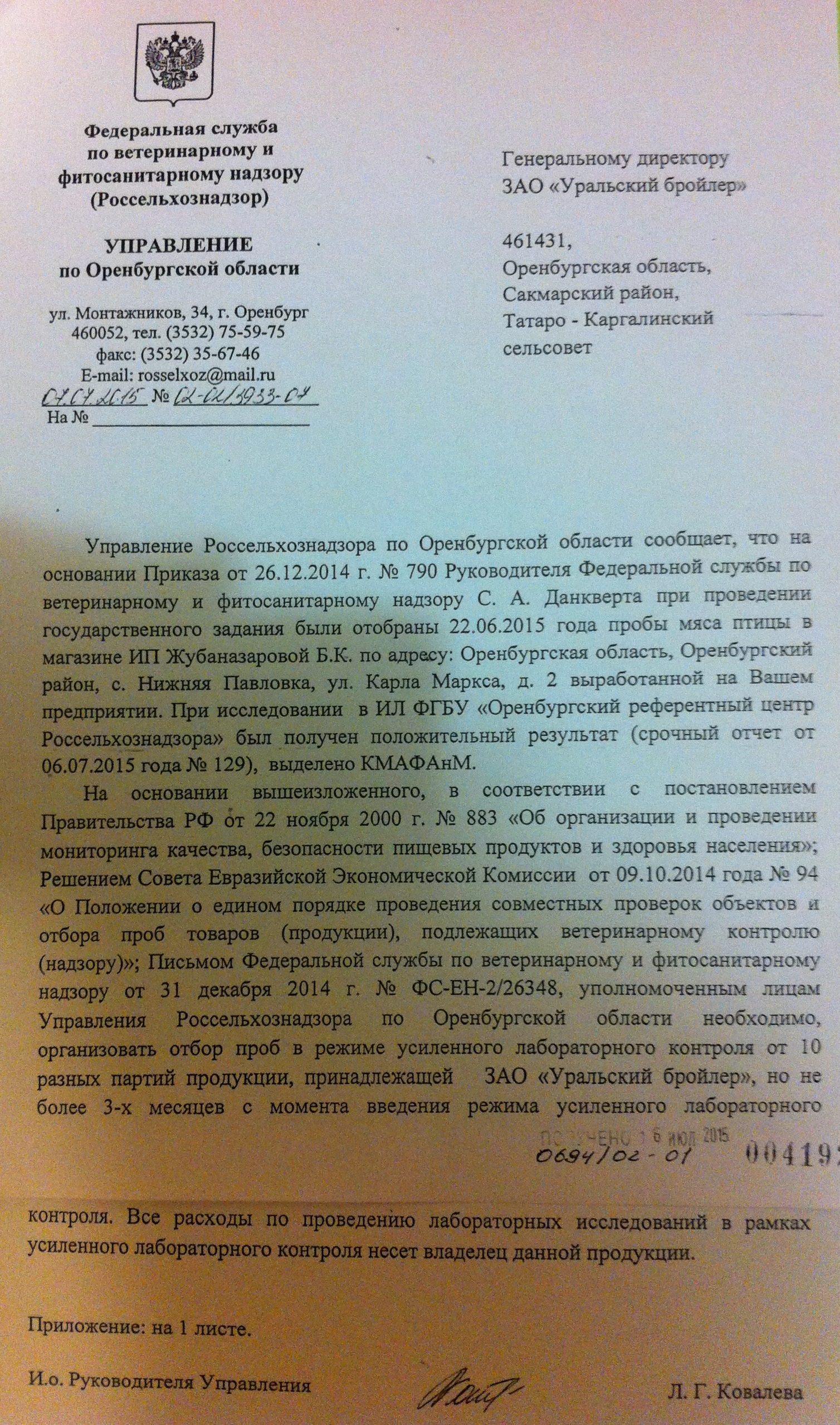 С целью выяснения вышеуказанных обстоятельств руководством ЗАО «Уральский бройлер» 20 июля 2015 года направлено письмо-запрос в адрес руководства Управления Россельхознадзора по Оренбургской области.
