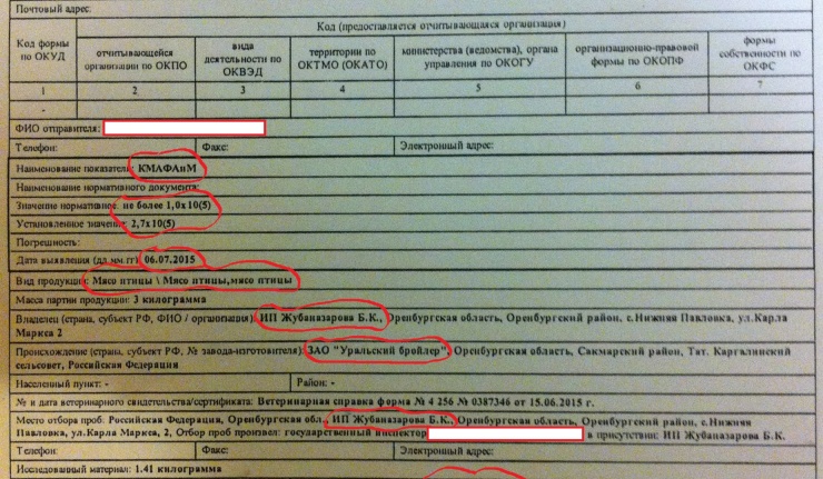 16 июля 2015 года в адрес руководства ЗАО «Уральский бройлер» поступил «Срочный отчет о выявлении продукции, не отвечающей требованиям ветеринарных санитарных правил и норм» № 129 от 06 июля 2015 года (фото 1), подготовленный ФГБУ «Оренбургский референтный центр Россельхознадзора», согласно которого в мясе птицы производства ЗАО «Уральский бройлер», продаваемого в магазине ИП Жубаназарова Б.К. в с.Нижняя Павловка Оренбургского района обнаружено превышение норматива по КМАФАнМ (количество мезофильных аэробных и факультативно анаэробных микроорганизмов или общая бактериальная обсемененность мяса. Число мезофильных аэробных и факультативно-анаэробных микроорганизмов (КМАФАнМ) является одним из основных показателей санитарного состояния мяса. Большое количество КМАФАнМ чаще всего свидетельствует о нарушениях санитарных правил и технологического режима изготовления, а также сроков и температурных режимов хранения, транспортирования и реализации пищевых продуктов. Высокая бактериальная обсемененность является частой причиной пищевых отравлений, возникающих у людей).