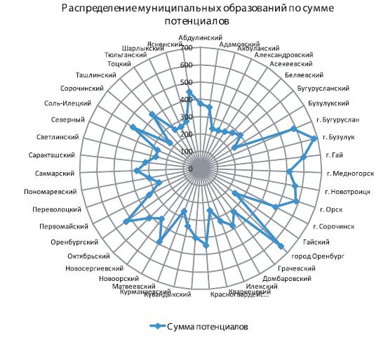 Что же получилось суммарно?Как и ожидалось, группу наиболее инвестиционно-привлекательных районов сформировали города области: максимальный суммарный потенциал получился у г. Бузулука, на втором месте оказался Оренбург. Наименее инвестиционно привлекательными выглядят Переволоцкий и Сорочинский районы. По сумме полученных рангов муниципальные образования были поделены на группы. Суммарный потенциал составили пять групп: низкий, пониженный, средний, значительный и максимальный. Суммарный риск - четыре группы: минимальный, умеренный средний и высокий.